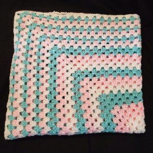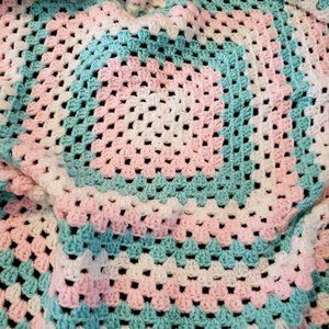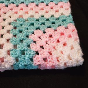 I crocheted this baby afghan and it is perfect for every season. The colors will work perfect for any baby. The colors compliment each other in baby pink and minty (mint green/blue green) with white being the main color. This afghan would look great in your nursery as an accent or to keep baby warm.