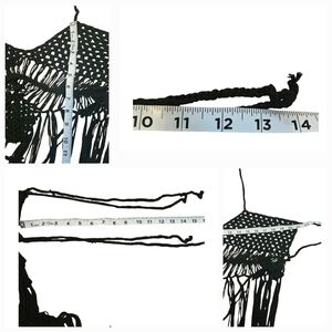 Crafted with 100% acrylic yarn, the top features triangular-shaped cups in a granny square and open stitch design. Black macramé knotting adds texture and fringe. With ties at the neck and back, you can style it halter, criss-cross, or wrap-around.