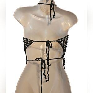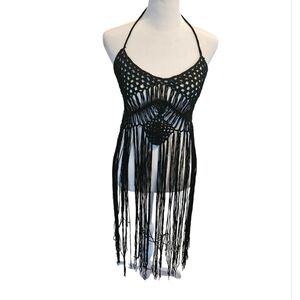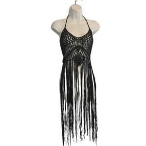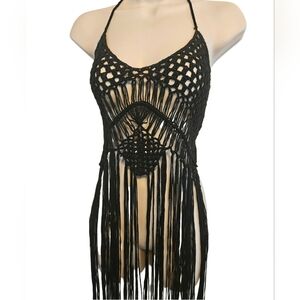Crochet Swim Cover Up Black Open Back Fringe Boho Crop Top