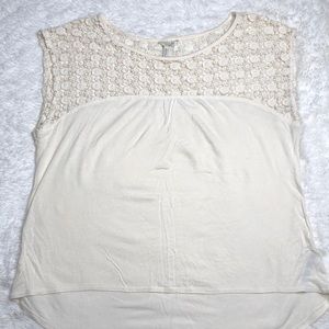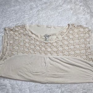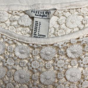 Cream top with a beautiful crochet design purchased from Forever 21. Size large and has a small stain that is pictured above. Very soft material and in pretty good shape. Worn only a few times. Smoke free home!