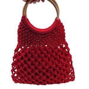This crochet tote bag features vibrant red yarn and sturdy wooden handles. Its spacious design is ideal for carrying essentials while adding a stylish touch to your outfit. granny core