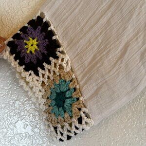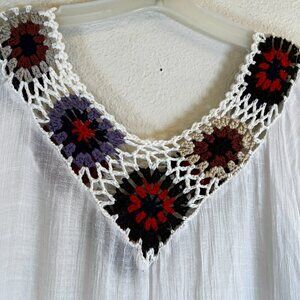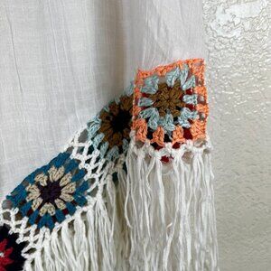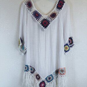 Crochet Trim White Gauze with Fringe Hem Boho Swim Coverup Granny Square S/M