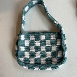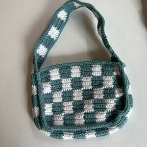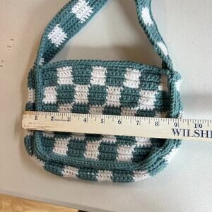 Crochet Unisex Small Shoulder Bag Blue Checkered Handmade