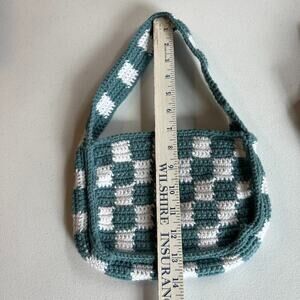 This handmade shoulder bag is perfect for anyone looking for a unique and stylish accessory. The bag features a blue checkered pattern made with acrylic yarn and has a rectangle shape with a bag width of 9 inches, a bag height of 7 inches, and a bag depth of 2 inches. The handle/strap is made with the same acrylic yarn and has a handle drop of 7 inches. The bag is perfect for travel, parties, and casual occasions. It has a crochet accent and is unisex. The bag is handmade in the United States and has a colorful theme with a beach, color block, fall, and summer design.