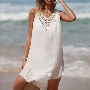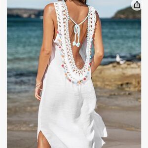 Crochet White Boho Multicolor Pom Poms Swim Cover Up