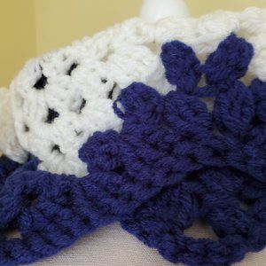 This neck warmer is totally adjustable so you can wear it as loose or as tight as you wish; just put the button through any whole in the neck warmer. The white and navy blue will look great with any jacket or outfit.