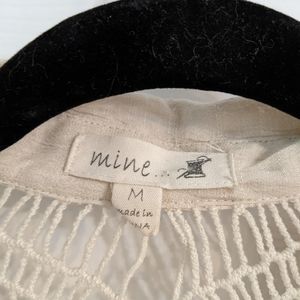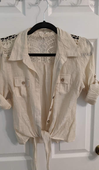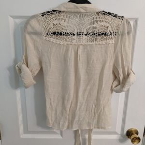 Crochet detail, front tie button down. has 3/4 length sleeves that you can roll up and button in place.