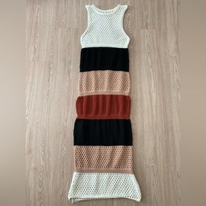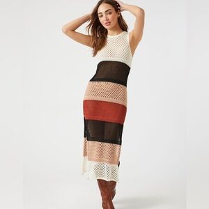 An open-knit midi dress featuring an allover striped design, semi-sheer construction, round neckline, sleeveless cut, split sides, and bodycon silhouette.