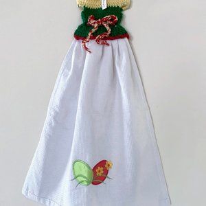 Cute white dish towel with Easter eggs on the front edge and crocheted top in the shape of a dress