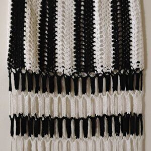 This beautiful black and white crocheted long skirt is perfect for any boho, festival, work or casual attire. The skirt is 27 inches long and features both vertical and horizontal stripes, giving it a unique and stylish look. It is designed for Junior size small and is made by the popular brand Forever 21. The top half of the skirt is lined for extra comfort, leaving the bottom half for peek-a-boo legs! The skirt is crocheted/knitted, adding to its overall appeal. It is a perfect addition to any wardrobe and can be worn for any occasion. Whether you are looking to add a touch of bohemian style to your outfit or just want a comfortable and stylish skirt, this is the perfect choice. This skirt looks so cute on. The elastic waist circumference is 25 inches, relaxed. The first picture is the front, the second picture is the back.