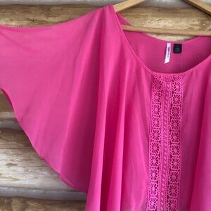 Gorgeous sheer flutter sleeve cropped crochet lace trim blouse with attached tank in "Baby Lips" pink! Love by Design Jr size XS. NEW!!