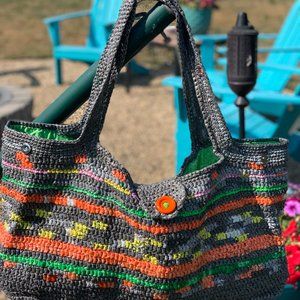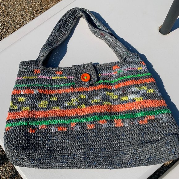 These reusable bag are extremely durable and since they are made of plastic, will last a long time. They do stretch a little bit more than a fabric bag would. The method of taking plastic bags, cutting them in strips and looping the pieces together creates PLARN (plastic yarn) that is crochet to make this unique one of a kind bag.