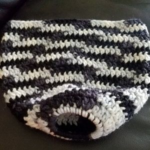 Black, gray and white crochet beanie; handmade; pull ponytail or messy bun through the top.