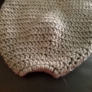 Gray crochet beanie; handmade; pull ponytail or messy bun through the top.