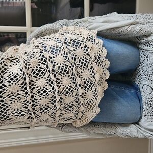 Crochet top/ cute with tank top underneath or bathing suit cover up. Approximately 29 inches top of strap to bottom hem(scalloped hem), 15 inches pit to pit, straps not adjustable