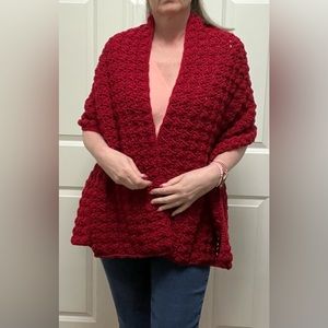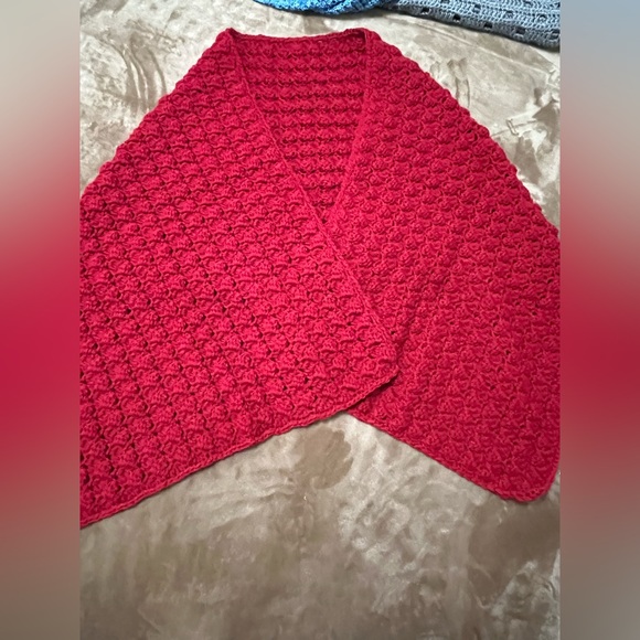 Crochet wrap. Slightly heavy in weight, 90% acrylic 10% alpaca, hand wash lay flat to dry.