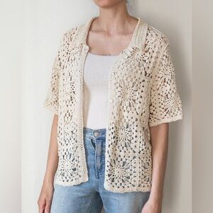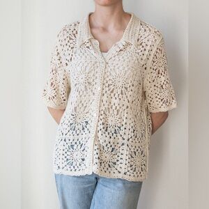 Chic crochet lace shirt with button-up front. Ideal for casual wear.