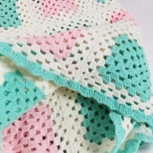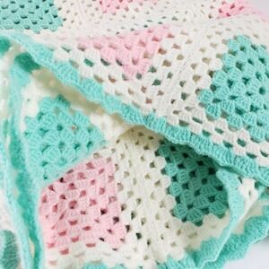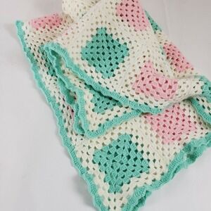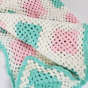 Crocheted Baby Lap Blanket Afghan Throw Handmade Pink Off-White Green 36” x 68”