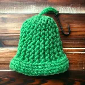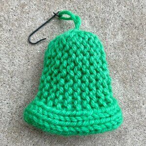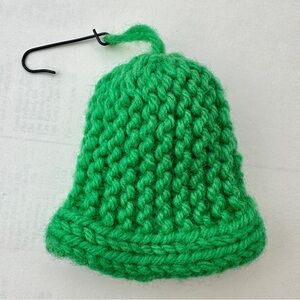 Green hand knitted hand crocheted Christmas bells. Christmas tree ornament in green with bells inside.