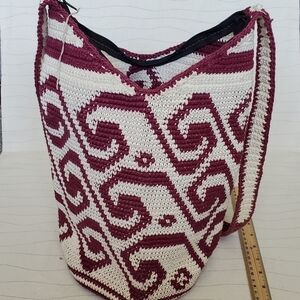 Crocheted Crossbody Shoulder Bucket Bag Maroon Cream Hobo Hippie Boho Handmade
