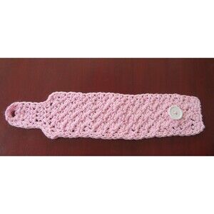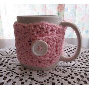 Crocheted cup cozy, coffee mug or tea warmer. Pink crochet cup cozy. Crocheted cup cozies are nice gifts for coffee drinkers, but also tea and any beverage to keep warm. Crochet cup cozy. Keep your your coffee or tea warm and it is cozy. A pink mug cozy with a white plastic button. Cup cozies make a nice stocking stuffer or housewarming gift. Fits on cups that are appropriately 10-1/2 inches in diameter. The cozy is approximately 3 inches tall and 11-1/2 inches long with a 2 inch tab, so about 13-1/2 inches long total. CARE: Hand wash and dry flat.