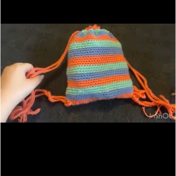Handmade coral, teal, and blue crocheted drawstring backpack 7in x 7in. Crocheted by my teenage daughter.