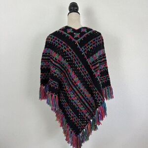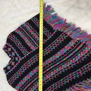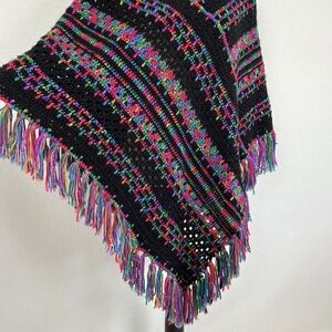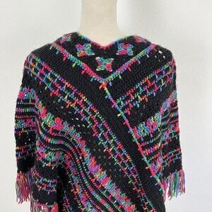Crocheted Handmade Boho Black Rainbow Loose Knit Fringe Shawl Poncho Sweater OS