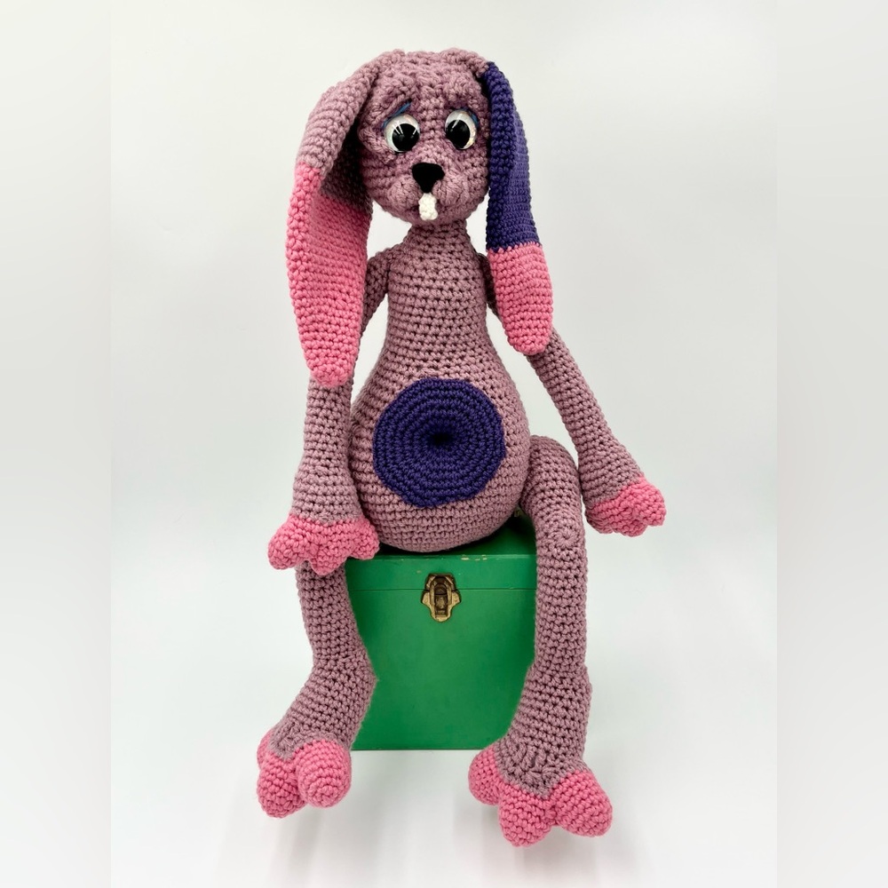 Handmade, crocheted bunny rabbit. Made with orchid, purple and pink yarn. Hand painted eyes by Darkside Crochet.