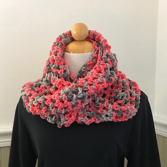 Crocheted scarf infinity style. Handmade. Scarf is looped twice around mannequin in photo.