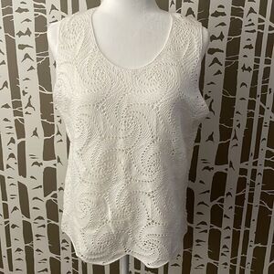 The pics don’t do this beautiful piece justice! Super pretty and feminine Boho crocheted white cotton ramie blend Liz Claiborne LizSport Petite summer tank. It has a substantial weight to it and the design reminds me of swirling water. Would be perfect with jean shorts for summer! Gently worn with no flaws to note. See pics for measurements.