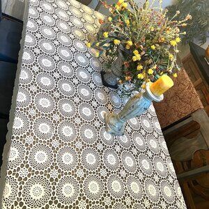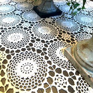 Crocheted Vintage Tablecloth-Handmade-Ivory/Cream-Approx. 68" x 108"-Rounded