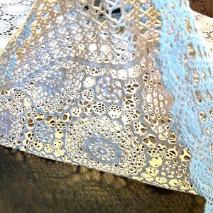Fits my long table and has rounded scalloped edging with over hang, could fit larger table