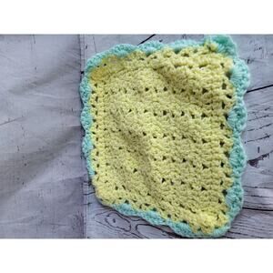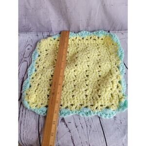 Crocheted Yellow Mint Green Baby Doll Blanket About 11x11in Handmade possibly in good condition