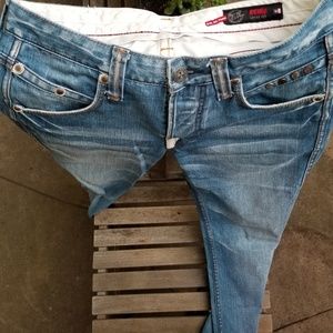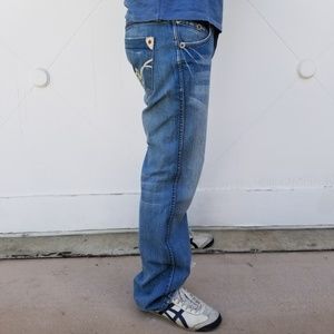 Did you ever once thought that you are the center of the universe and everything else rotated around your awesomeness? You'll definitely feel your inner sun once you wear this pair of gorgeous blue jeans. Think of it as the ultimate club gear, featuring unique leather trimming and design on the pockets and the beautiful denim wash it has which contains hints of dark and light. This pair is in perfect condition, Instagram ready and ready for the beat. Zip fly, 99% cotton, 1% spandex.