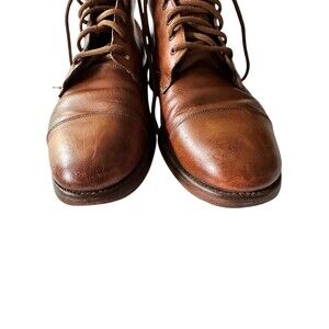 Good preowned condition. Please take a look at all photos- they are part of condition description. Overall good shape with minor flaws. The right boot has a couple of rips in the leather at the top (as shown on photos), and its missing a small piece by the first hole (also pictured). Size 10. Handwritten model and size inside. Some natural creases in the leather.