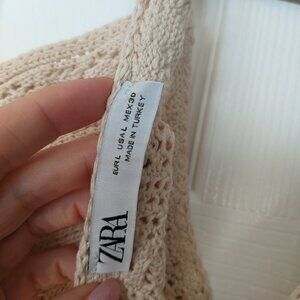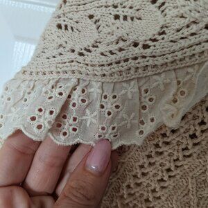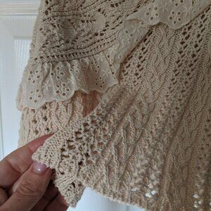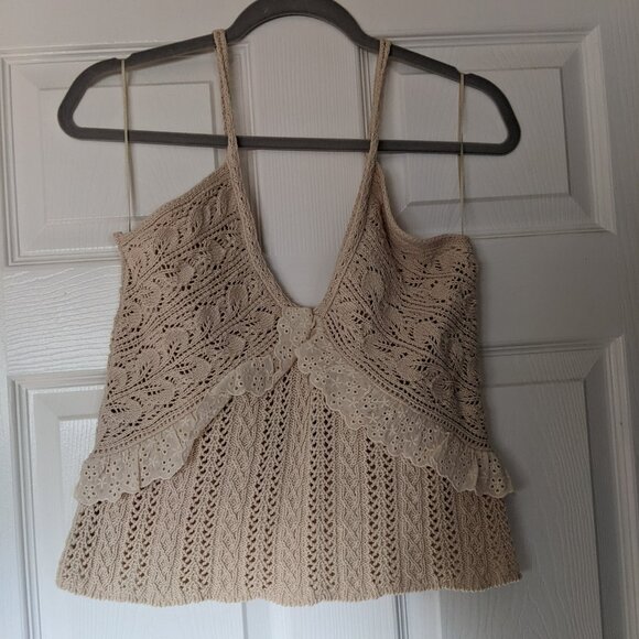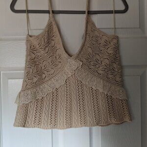 Heavy crochet tank with eyelet ruffle detail. V neck front