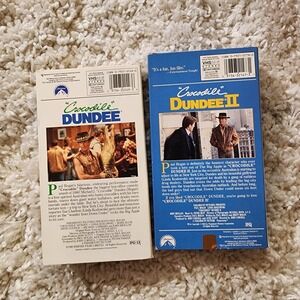 Collectible set of VHS tapes featuring Crocodile Dundee I and Crocodile Dundee II, starring Paul Hogan and Linda Kozlowski. These vintage tapes offer a nostalgic cinematic experience, showcasing the iconic adventures of Mick "Crocodile" Dundee from the Australian Outback to the bustling streets of New York City. Both tapes come in their original Paramount Pictures cases, complete with cover art and descriptions of the movies.