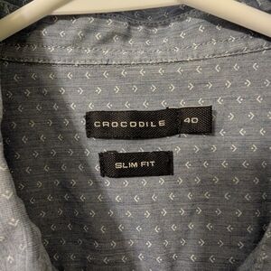 This crocodile slim fit button down long sleeve shirt in a sleek light blue hue offers a timeless casual style with its classic collar and slim fit. Crafted from a smooth fabric, it provides comfort and versatility for everyday wear. Size 40 UK Size medium in US.