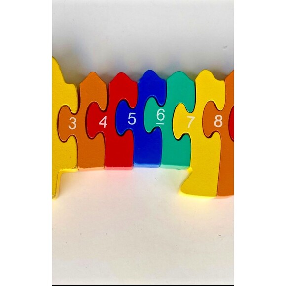 It is a 10 piece puzzle shaped like a crocodile, with numbers 1-10 on the body segments and the head.