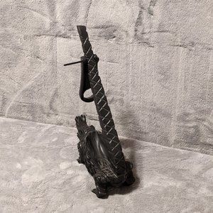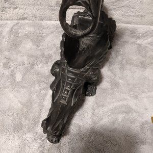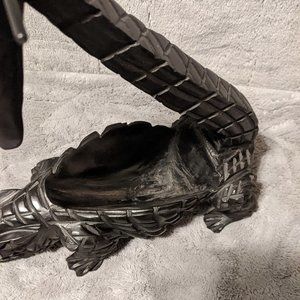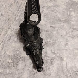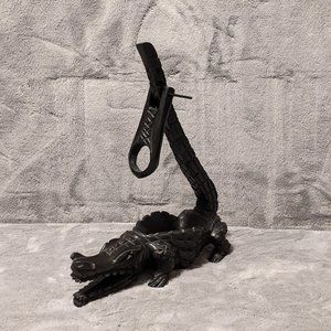Crocodile Wine Bottle Holder Wooden Display Bar Home African Jungle Safari Decor. Made of heavy solid wood. Weighs a little over 2 lbs. About 12 inch length x 14 inch tall .Pre-owned. Little dusty. Not sure if the tail was fixed at one time or if it was made this way. Is very sturdy but I would not carry it by the tail. Please see close-up photo.