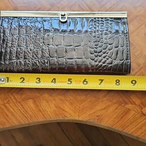 Stunning burgundy wallet features a stunning crocodile-embossed design, silver hardware, inside zippered pocket for change, places for cards, and a place for bills. This is in great previously owned condition.