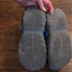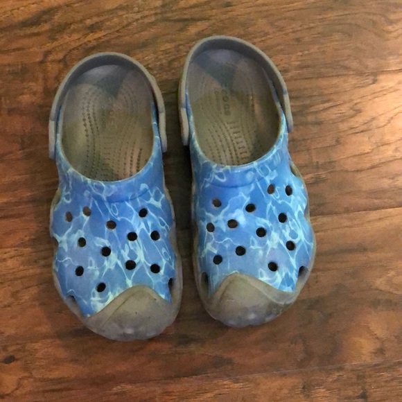 Blue crocs, junior 2. There is a scuff mark but still a lot of life left!