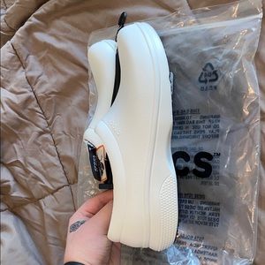 Brand new, never worn. On the clock work slip on crocs. White, bought for nursing.