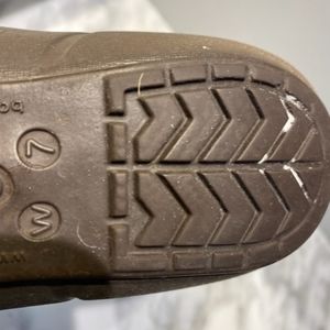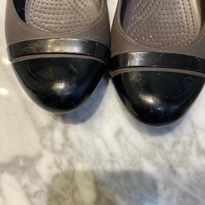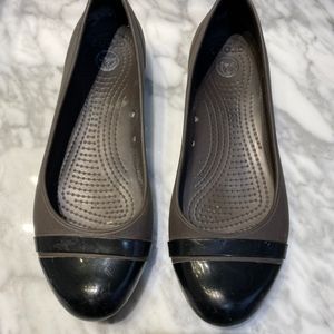 Selling a pair of brown with black trim Crocs slip on flats with couple of scratches on the tips other than that in good condition size 7 $20