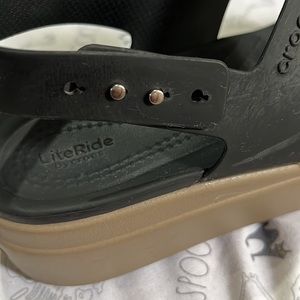Croc Sandals. I do have wide feet and they do feel snug. They do have stains that do not come out.