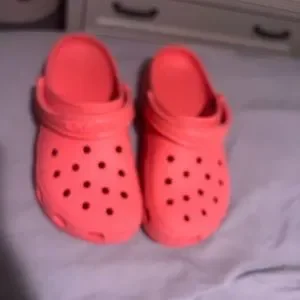 Women’s size 7 crocs. A pink/orange color. Super cute ! Great condition. I will add in a bonus jibbit to whoever buys!