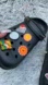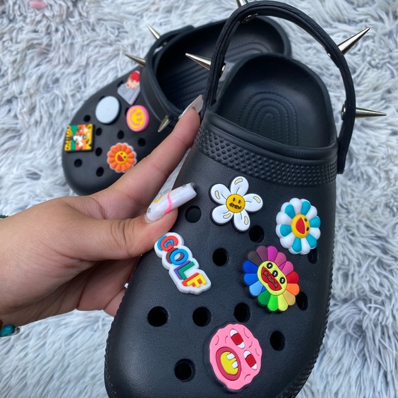 Crocs with 10 random charms with 4 spikes.