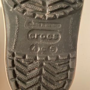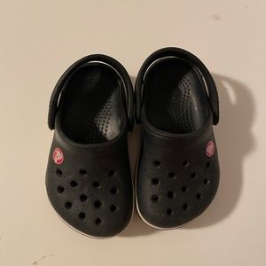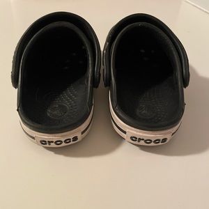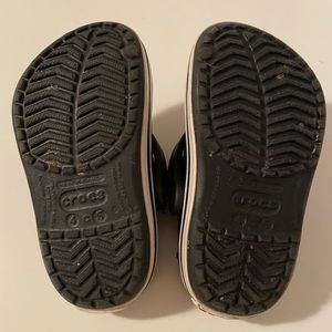 Lots of life left in these super cute unisex toddler crocs. Size 4/5. Black and white color. Back strap in great condition.