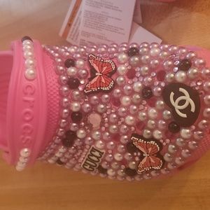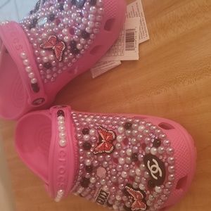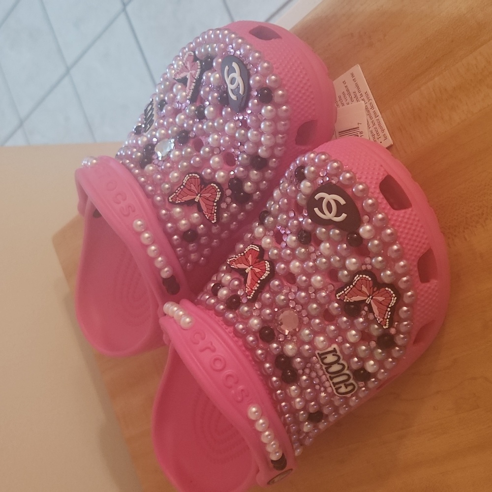hand crafted size 8 crocs with various assorted stones added onto shoes specifically for style and class. They're very beautiful.