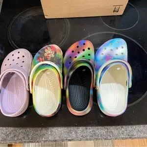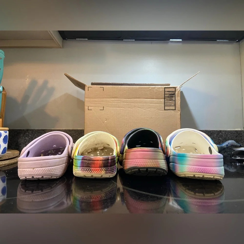 Purple are J1, white tie dye with darker colors is a J3 and the larger white tie dye is a W8. The black are what I purchased as a W7. They are significantly more narrow than all of them, much higher/deeper in the back than the ones purchased directly from crocs store and they wobble where non of the others do. Something seems off about them.